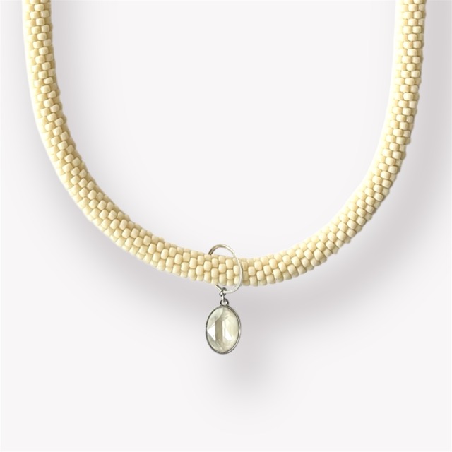 ビーズクロッシェの技法で編み上げた、立体感のある一本。 やわらかなオフホワイトが首元を明るく見せ、 きれいめな装いにも自然になじみます。 トップには貴和クリスタルのビジューを。 色を揃えることで、統一感のある大人の遊び心を表現しました。 リングに通したデザインのため、 トップは簡単に取り外せる2way仕様。 静かに纏う日も、華やぎを足す日も。 その日の気分で印象を変えて楽しめます。 留め具はマンテル仕様で着脱もスムーズです。