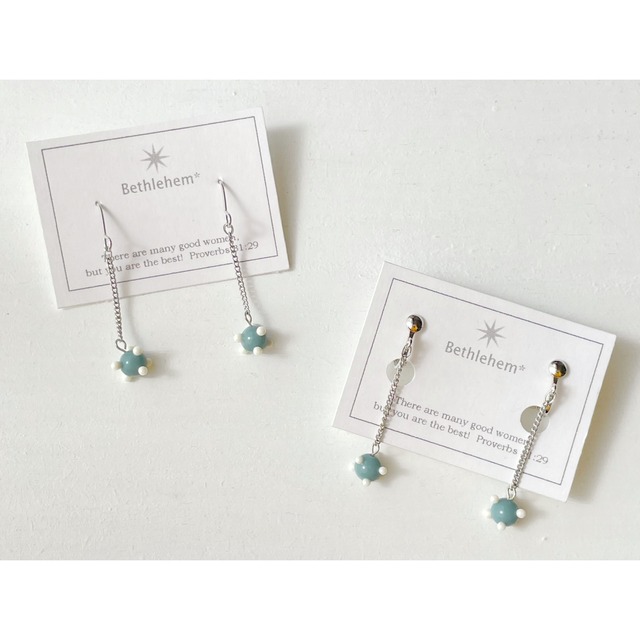 貴重なガラスビーズを使用したアクセサリーです。 小粒なつぶつぶがゆらゆらゆれて 下に付いているつぶつぶビーズは、ガラスビーズ作家のTSUKIMIビーズさんの作品で、ひとつひとつ手作業で作られている貴重なガラスビーズです ♩ 手作りなのでひとつひとつの表情が違ってオンリーワンのニュアンスに♡ カラーはスモーキーなブルーで、普段ビビッドなファッションをしない方でもさらっと着用しやすく、ヘビーローテーション間違いなし! 可愛いだけじゃなく、どこか目を引くデザイン。 ポスト部分がステンレスなので金属アレルギーの方も使いやすいです。 イヤリングはニッケルフリーメッキでこちらもアレルギーが出にくい素材を使用しています。 さらにソフトフィットイヤリング金具を使用しているので、長時間着用しても痛みが出にくいのが特徴です。 シリコンカバー付き。 全長:約4.5㎝
