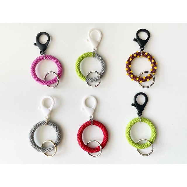 チューブクロッシェという技法で仕上げたキーリングです。 じっくり丁寧に一粒一粒手作業で編み込みました。 カバンに取り付ければ鍵を無くす心配がなくなります! 全長: 約10㎝ カニカンの内輪: 1.5㎝