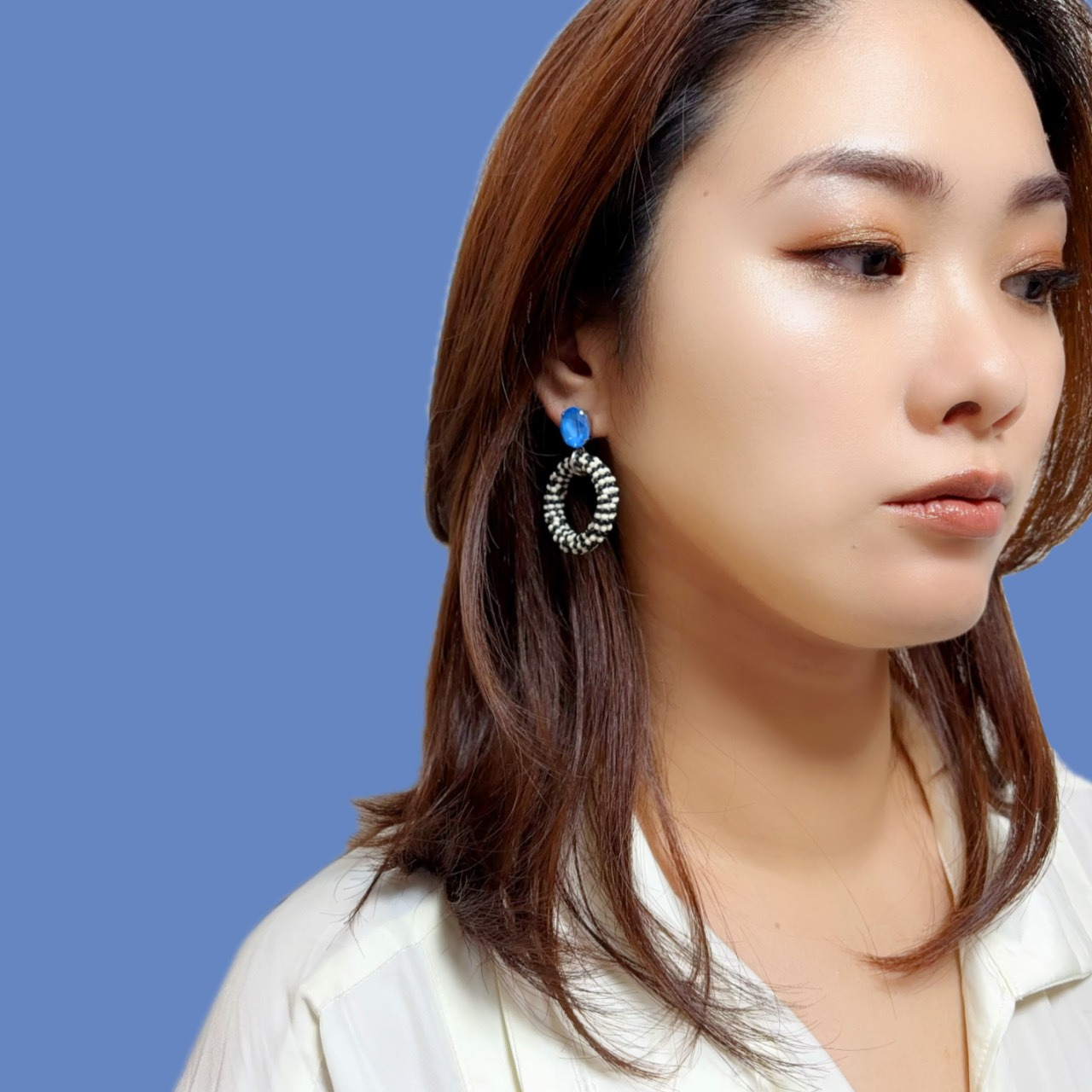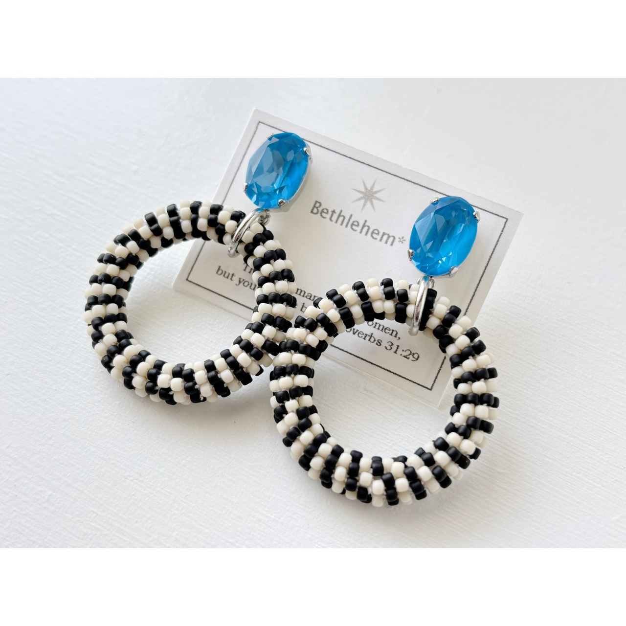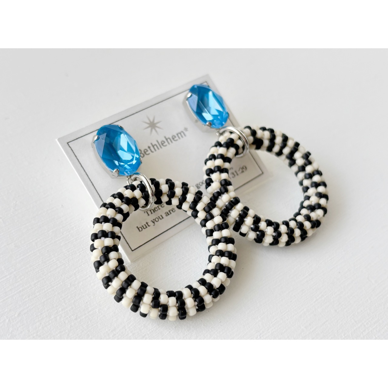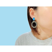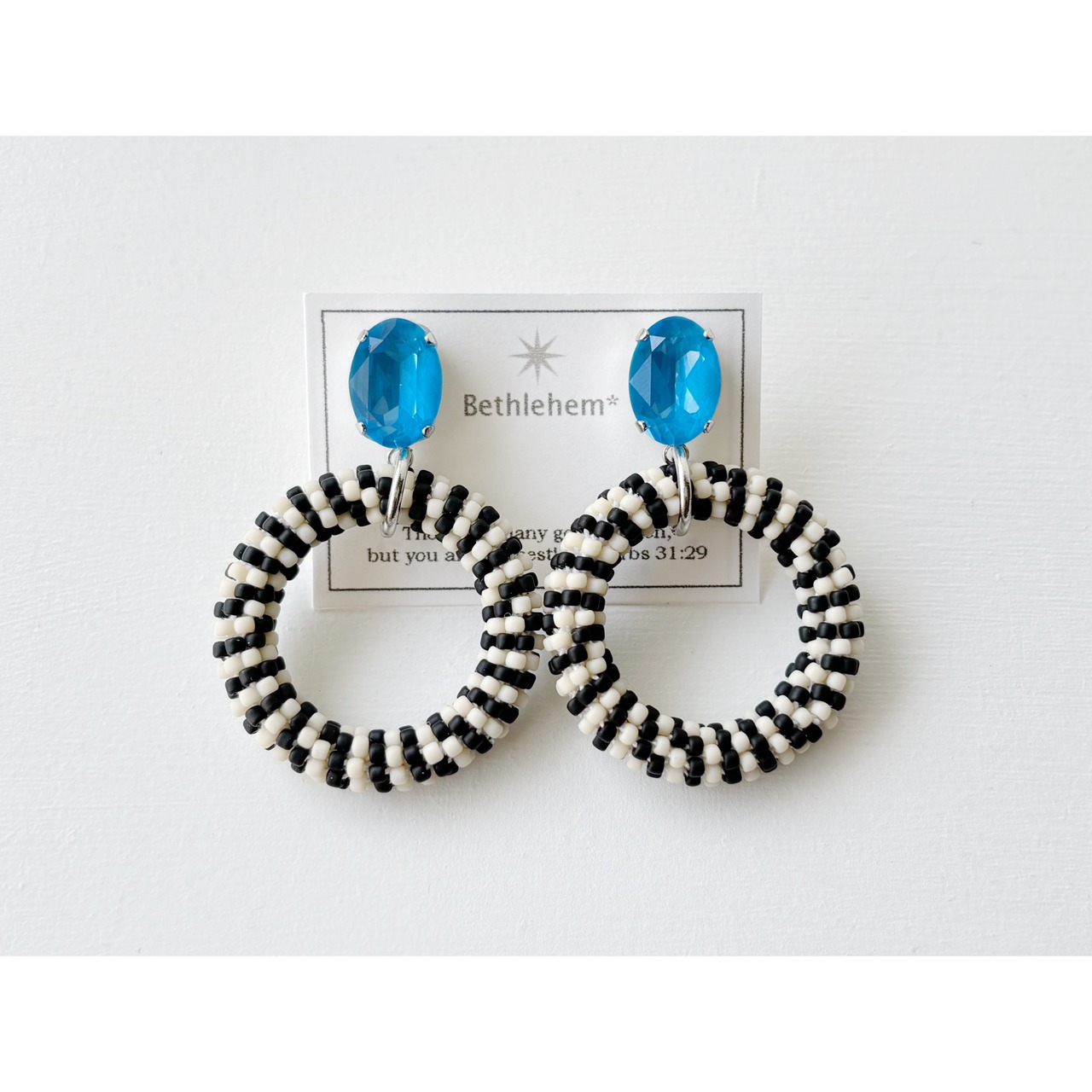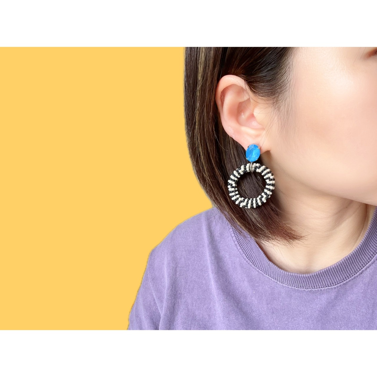 鮮やかなブルーのガラスビジューと、モノトーンのビーズで編み上げたサークルパーツが印象的な大ぶりピアス。