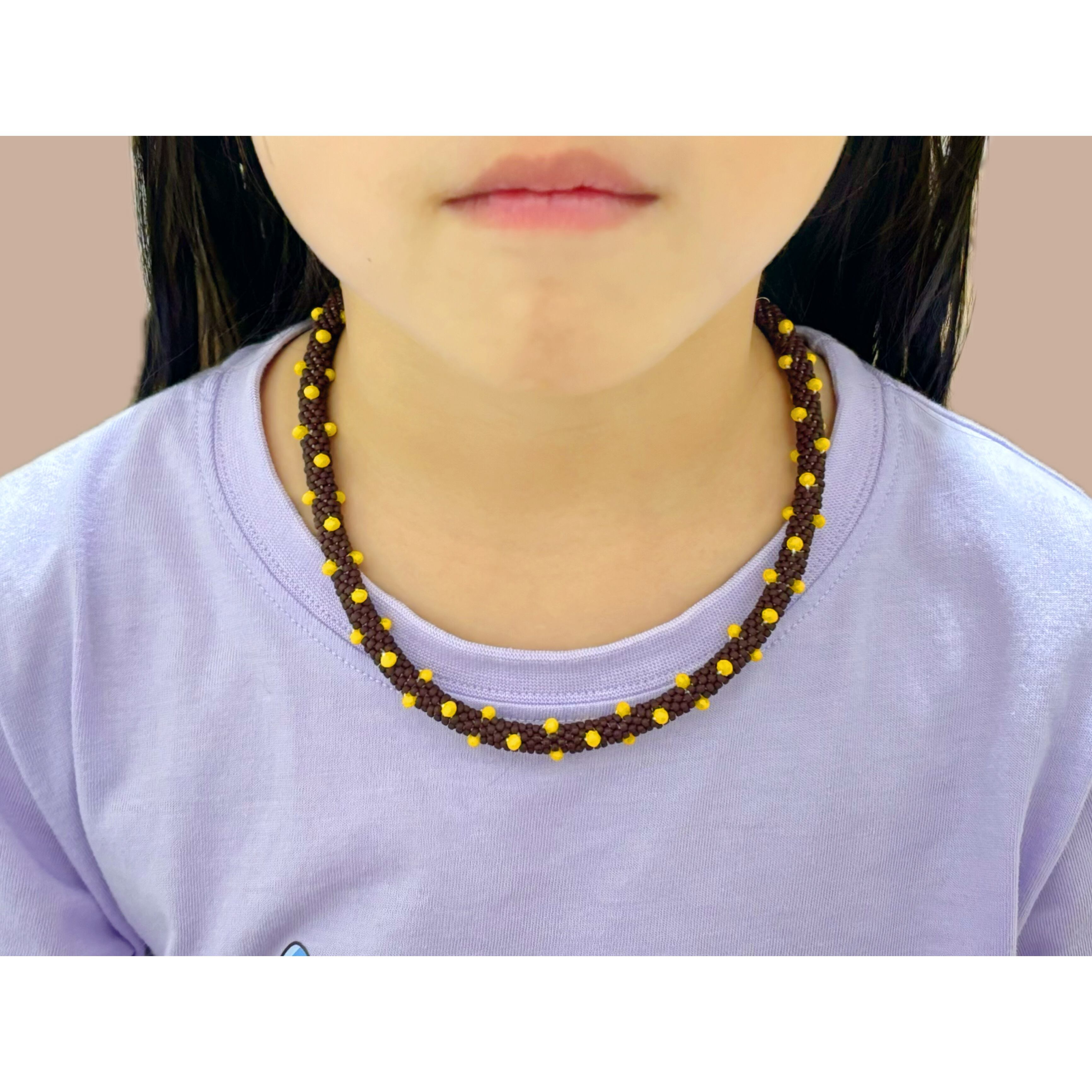 落ち着いた印象のマットブラウンのビーズをベースに、鮮やかなイエローのガラスビーズをアクセントとして散りばめました。つや消しの質感の中に、イエローのビーズが優しく光を取り入れて、控えめながらも印象的な輝きを放ちます。