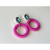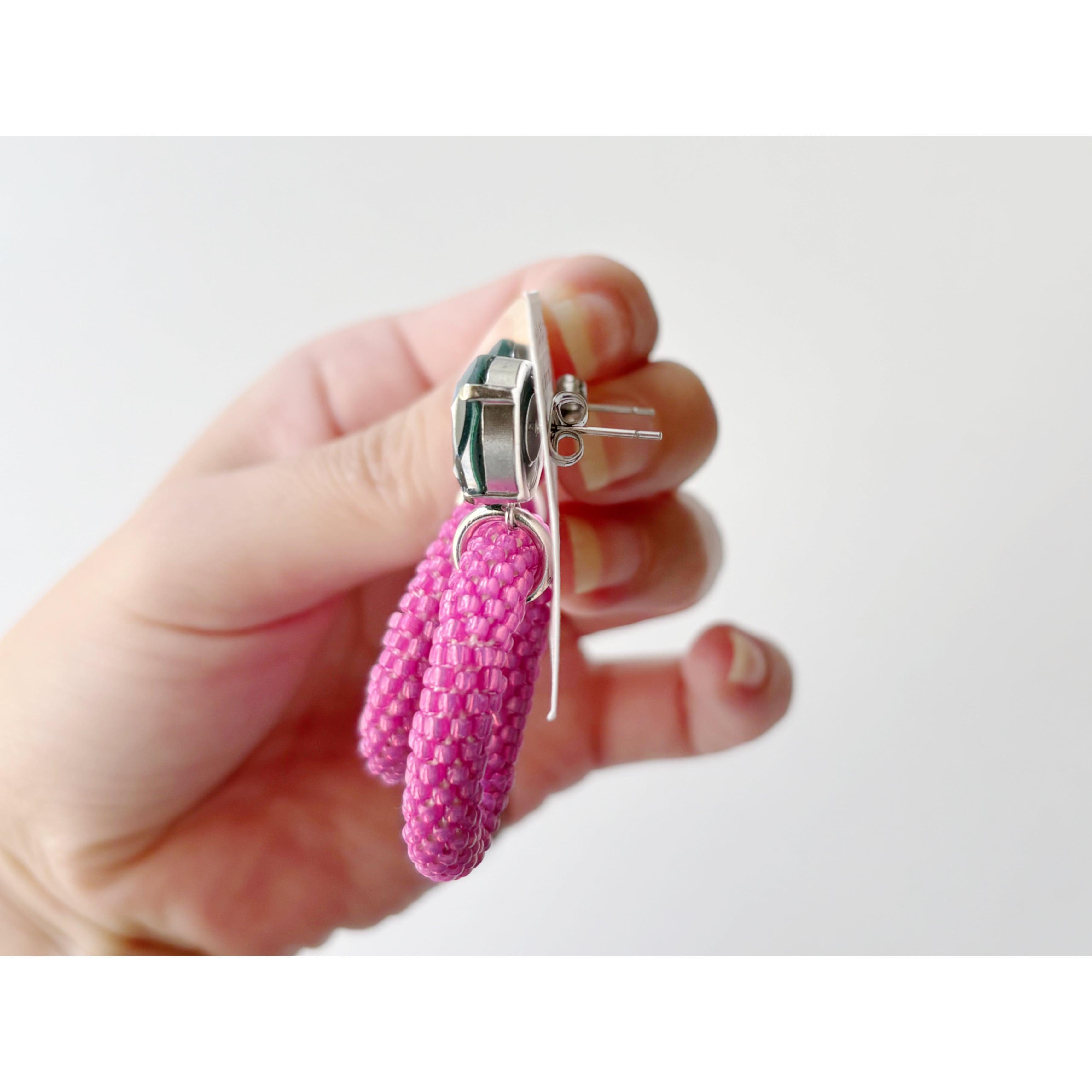深みのあるグリーンのクリスタルと、鮮やかなピンクのビーズサークルを組み合わせた、存在感のあるイヤリング/ピアスです。