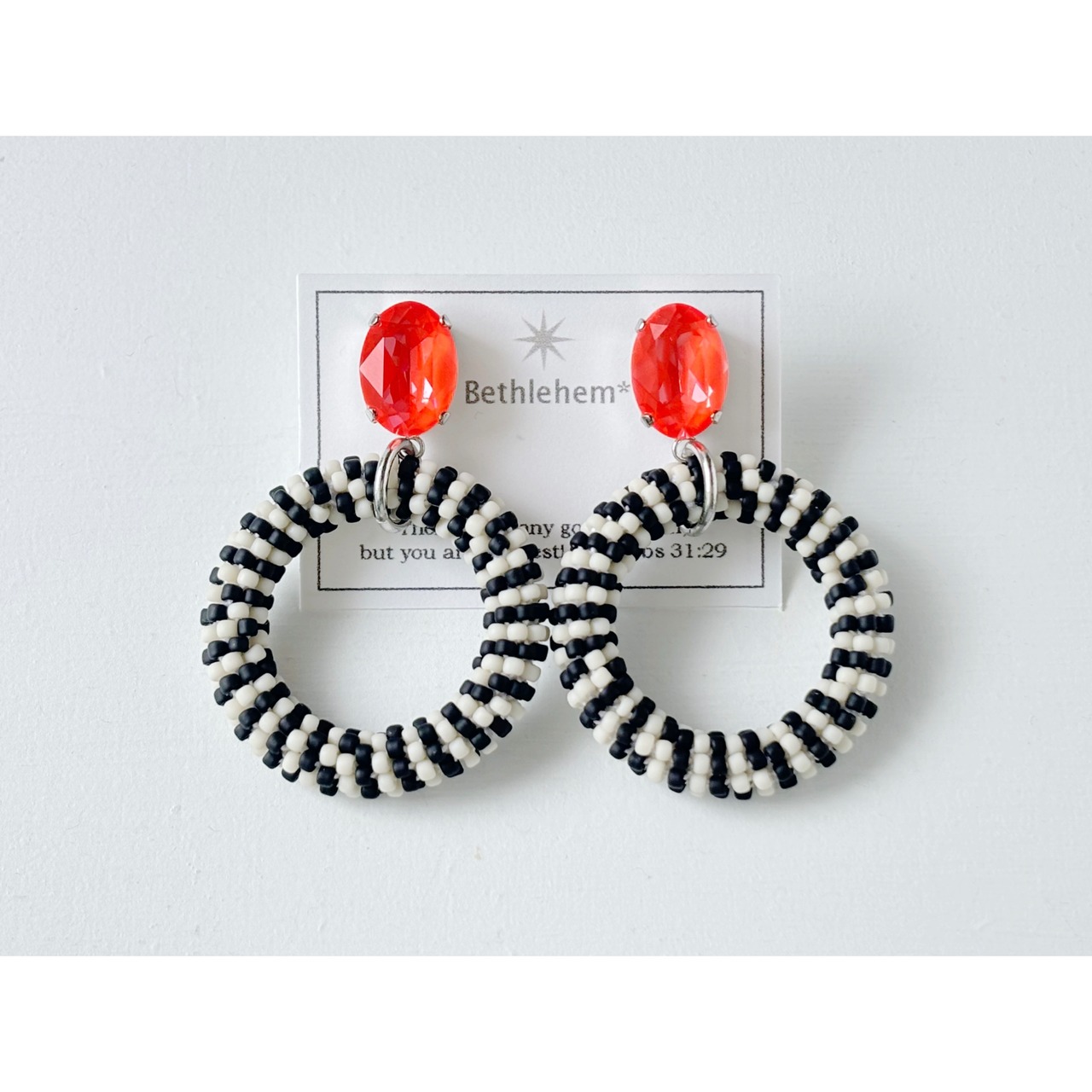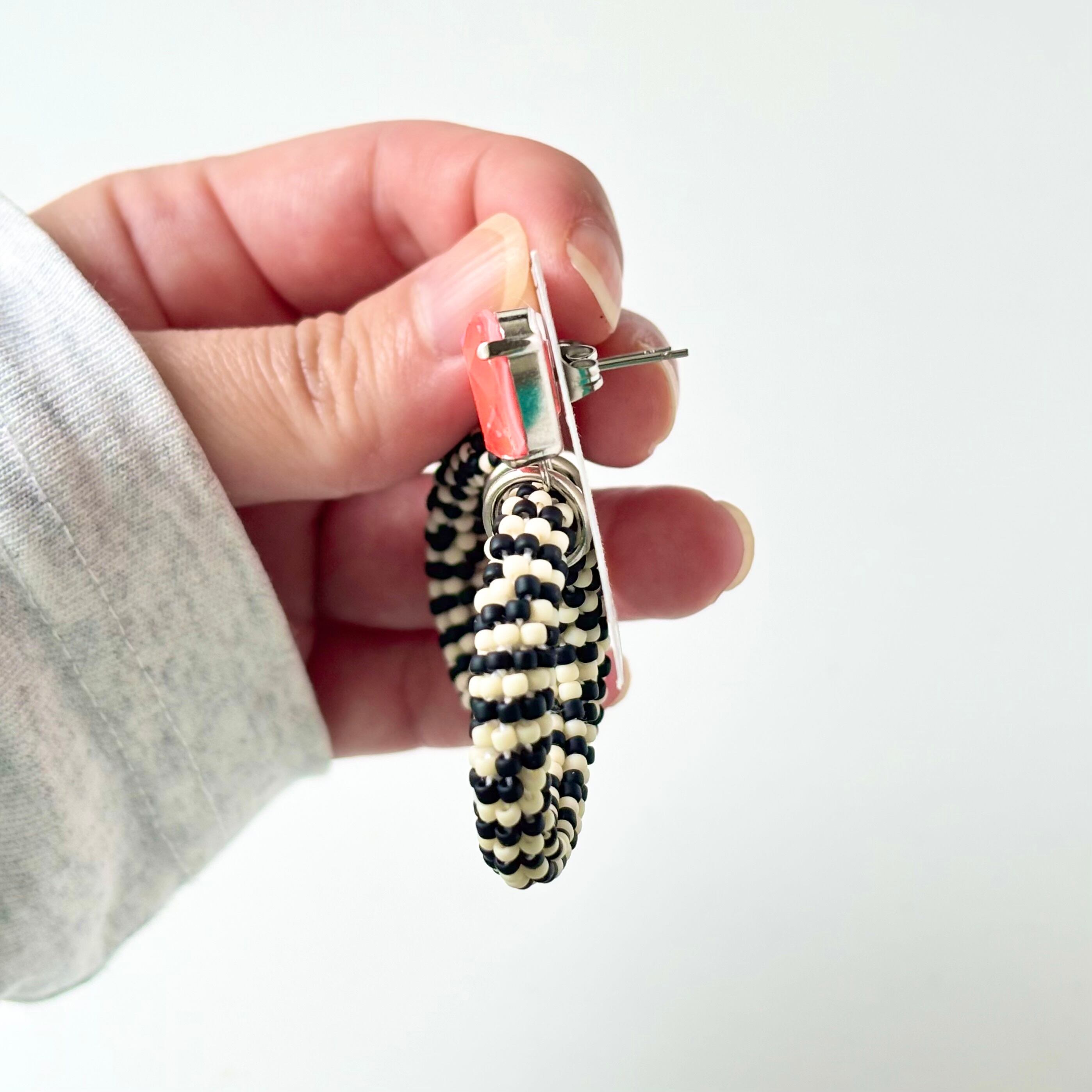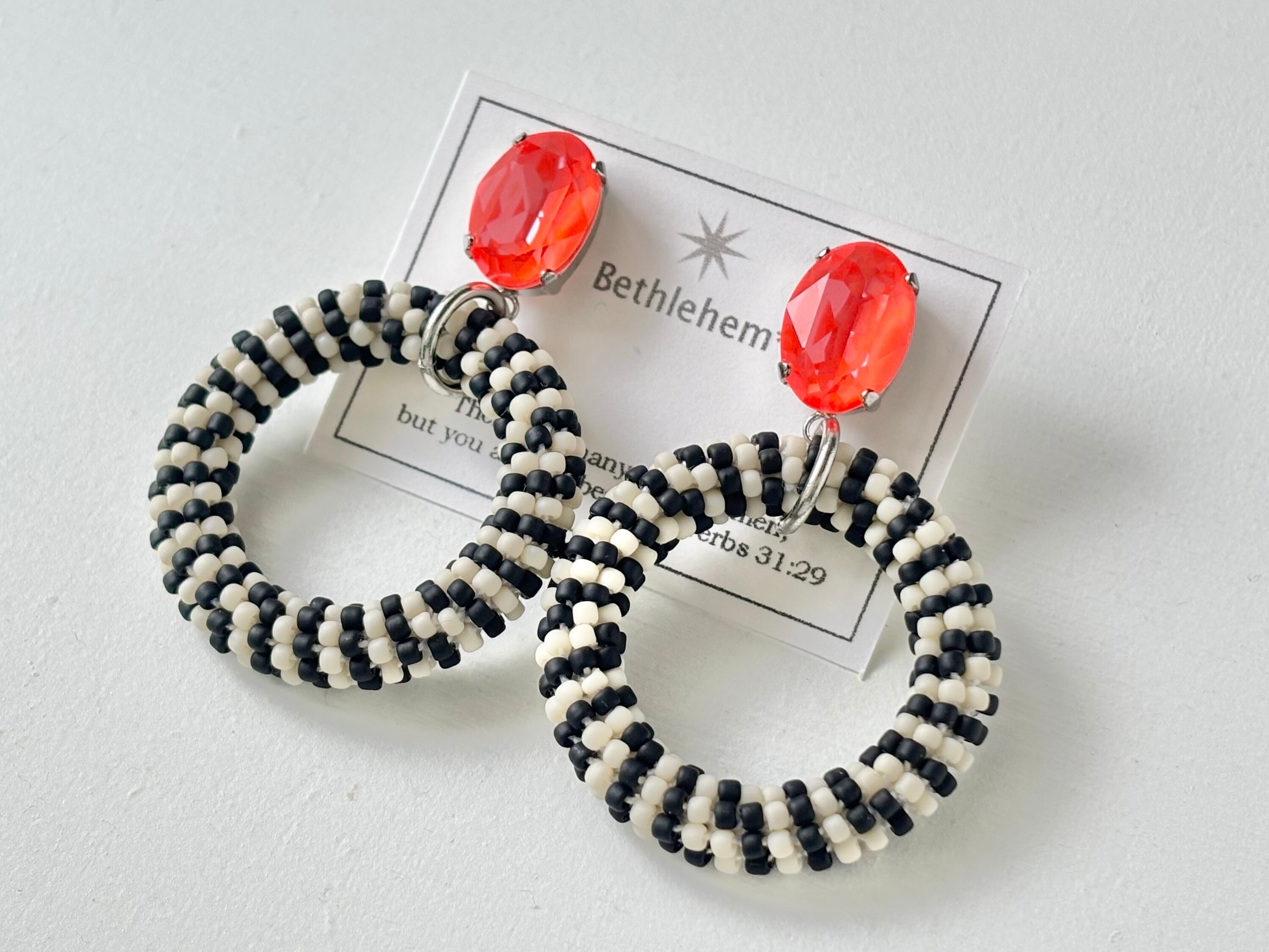 下部のサークルパーツは、白と黒のシードビーズをひと粒ずつ丁寧に編み込み都会的なデザインに。