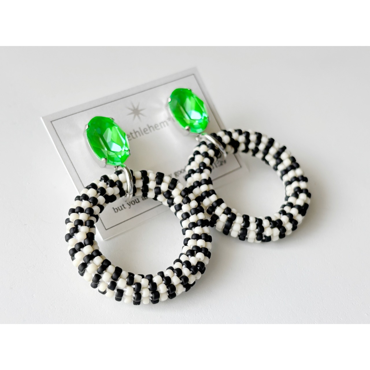 下部のサークルパーツは、白と黒のシードビーズをひと粒ずつ丁寧に編み込み都会的なデザインに。