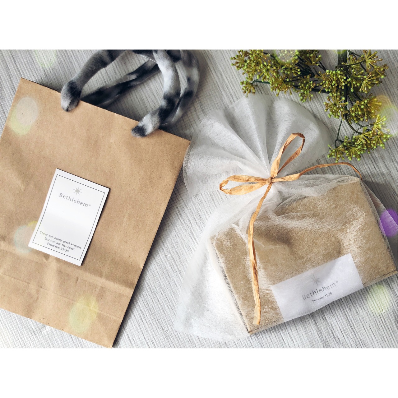 白の不織布袋でラッピングいたします。