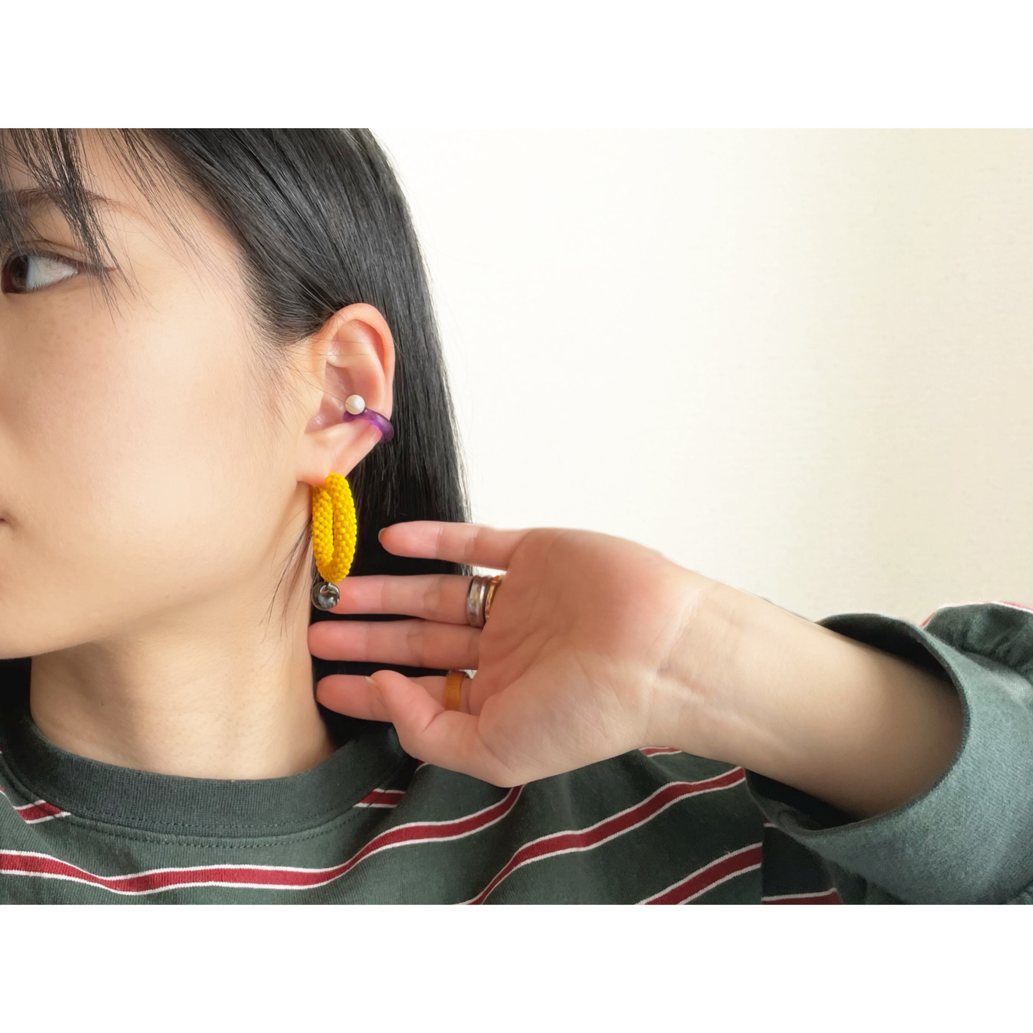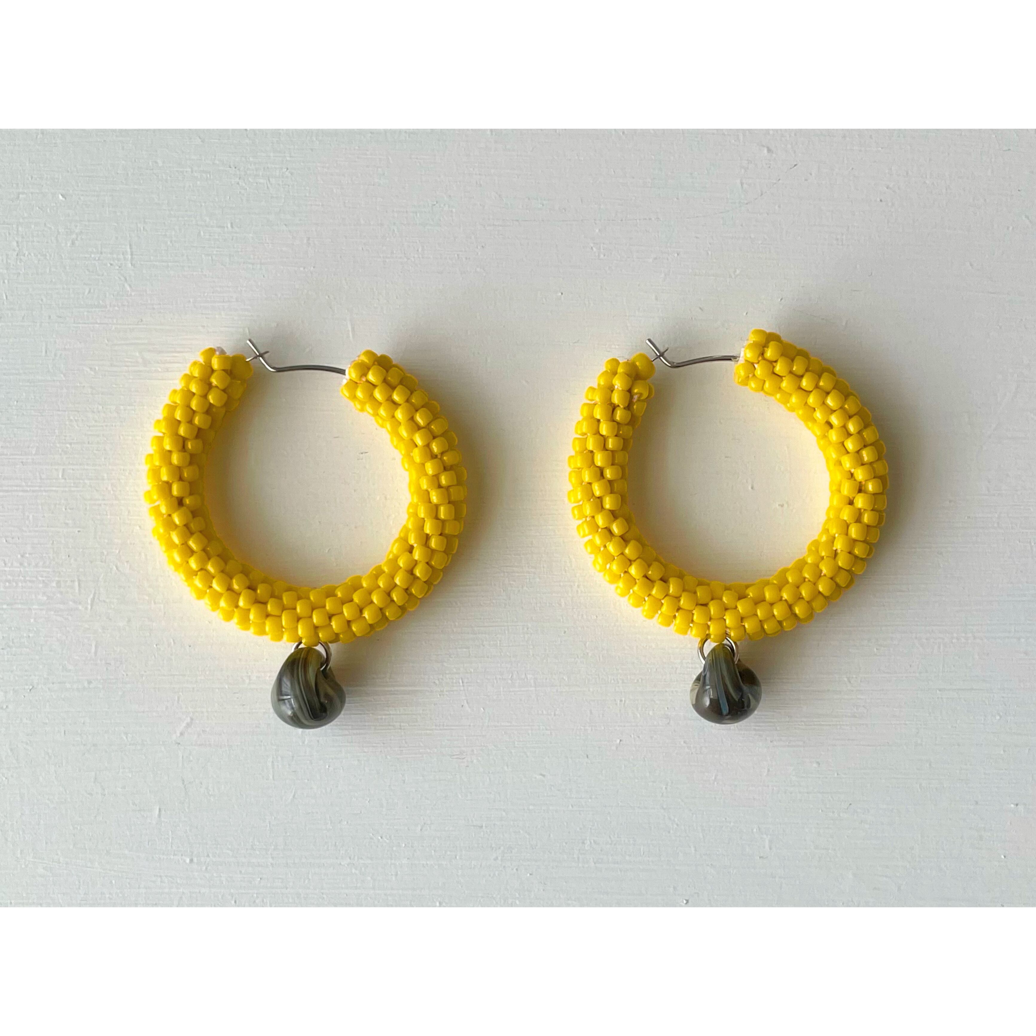 ビーズをひと粒ひと粒丁寧にチューブ状に編んだフープピアスです。
