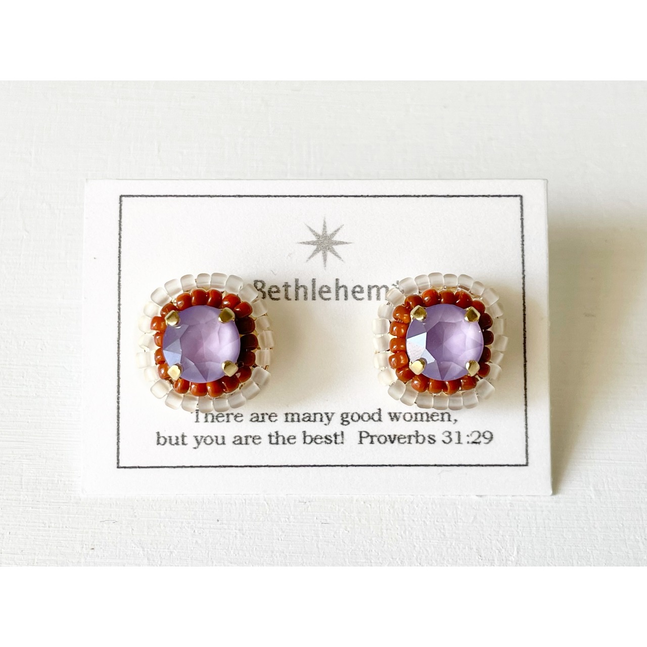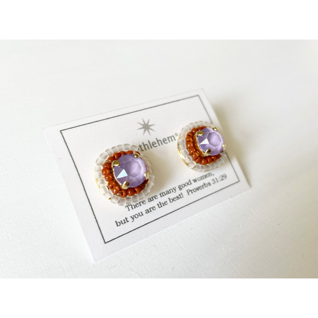 スワロフスキー製のビジューを、こつぶなビーズで囲んだコロンとしたイヤリングです。