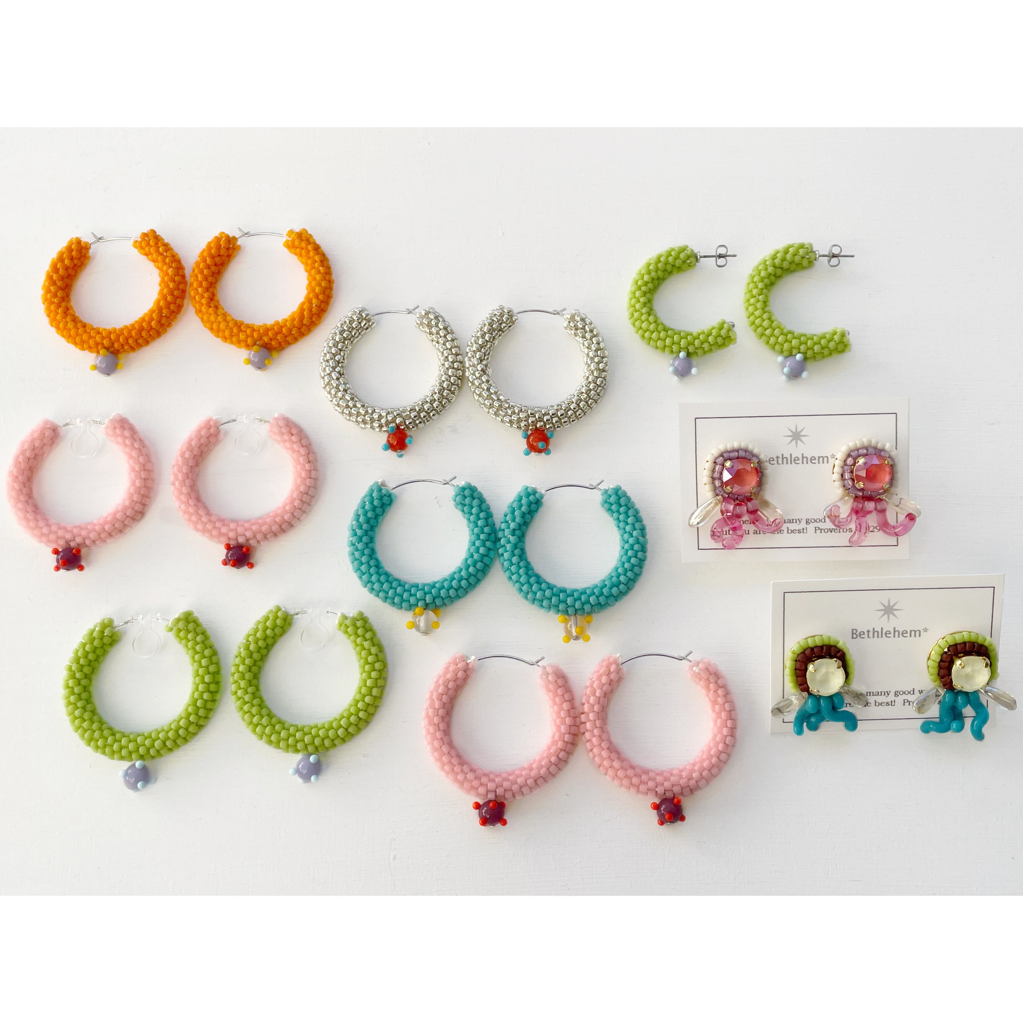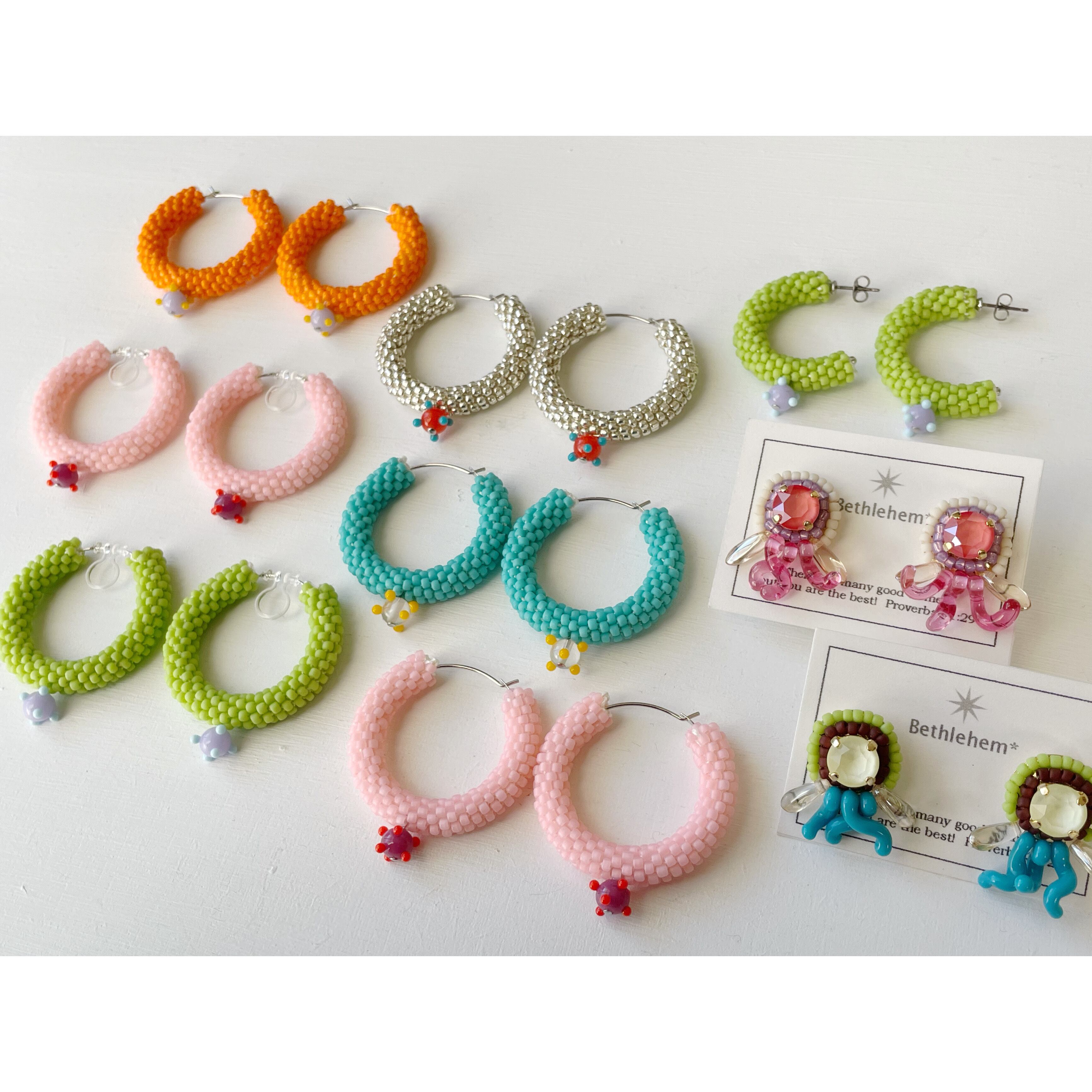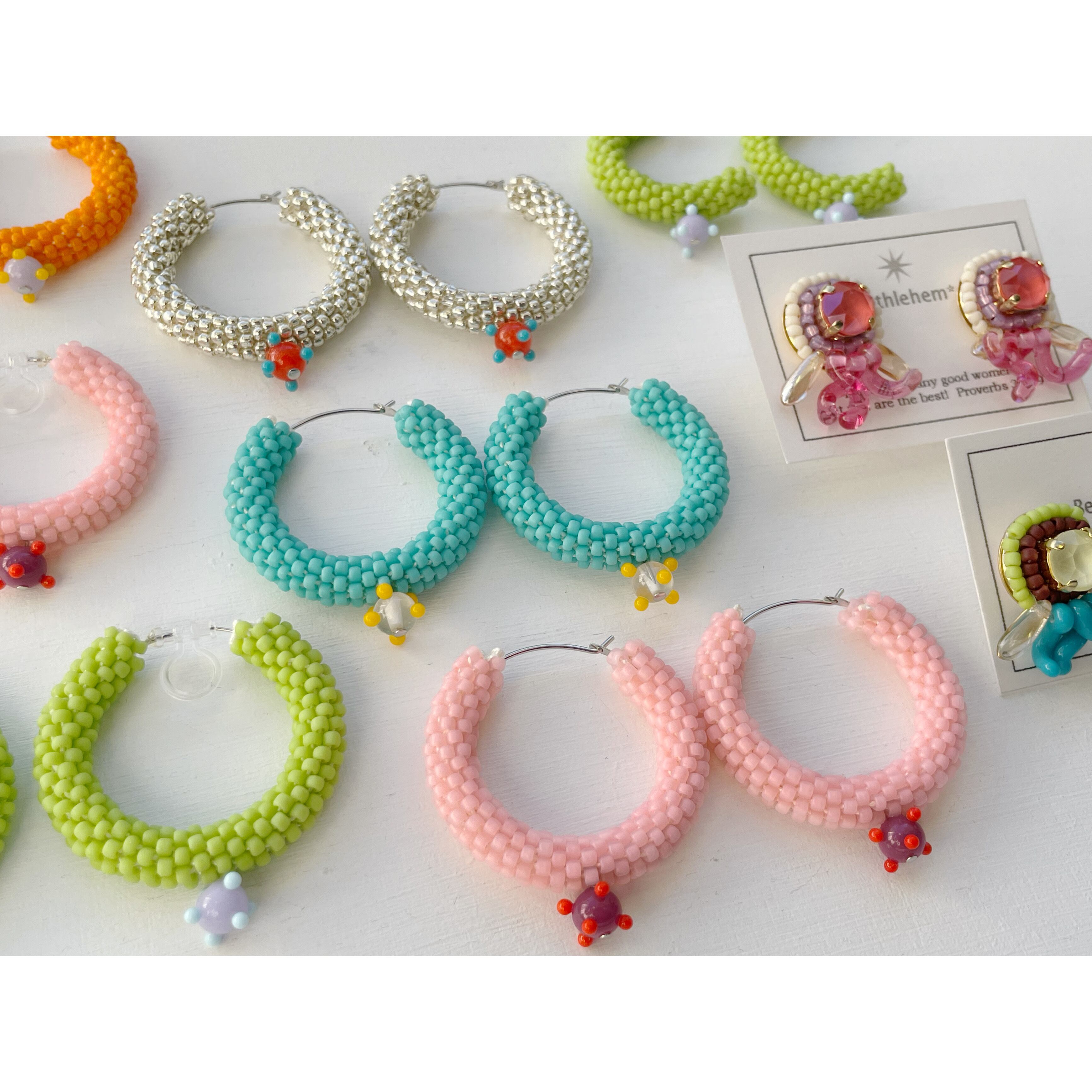 ビーズをひと粒ひと粒丁寧にチューブ状に編んだフープピアスです。