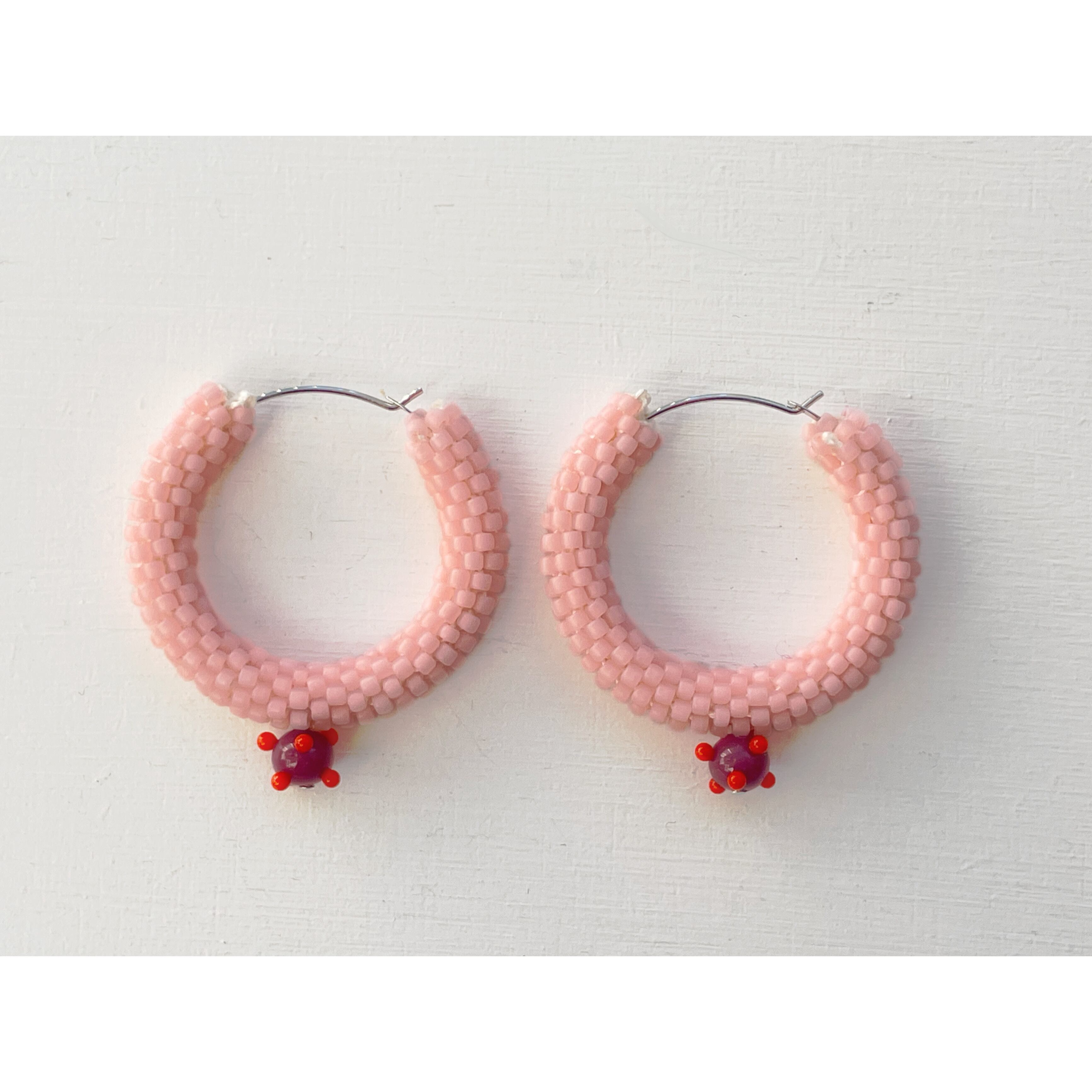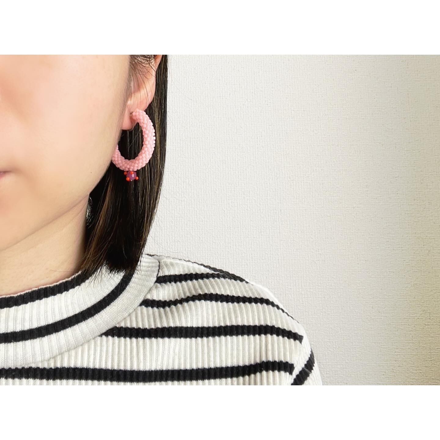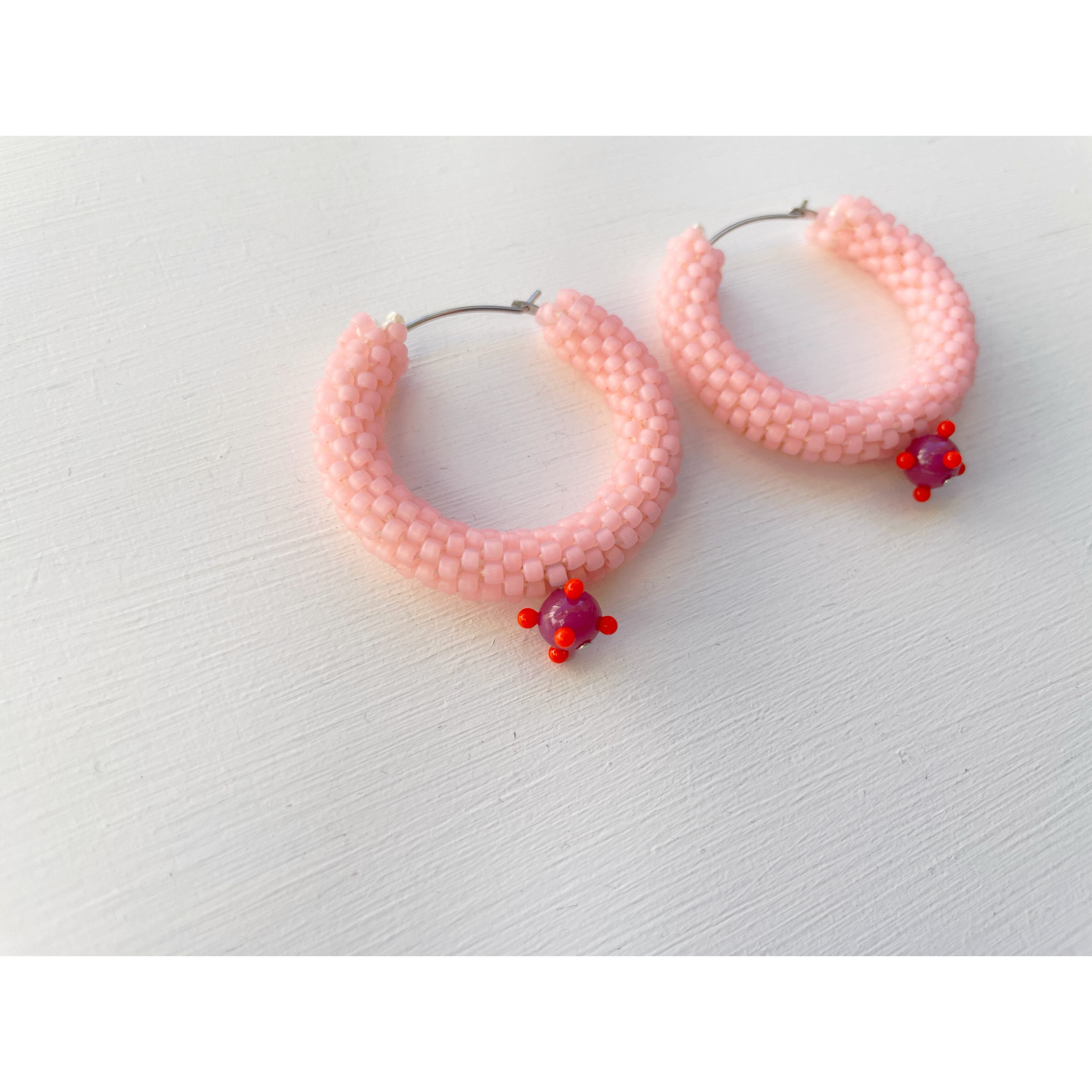 淡くてミルキーなピンク。キッチュな雰囲気で可愛いフープピアスに敢えて濃いめで少し渋めの赤紫のつぶつぶと合わせて、甘辛のバランスを取りました。こだわりポイントです!