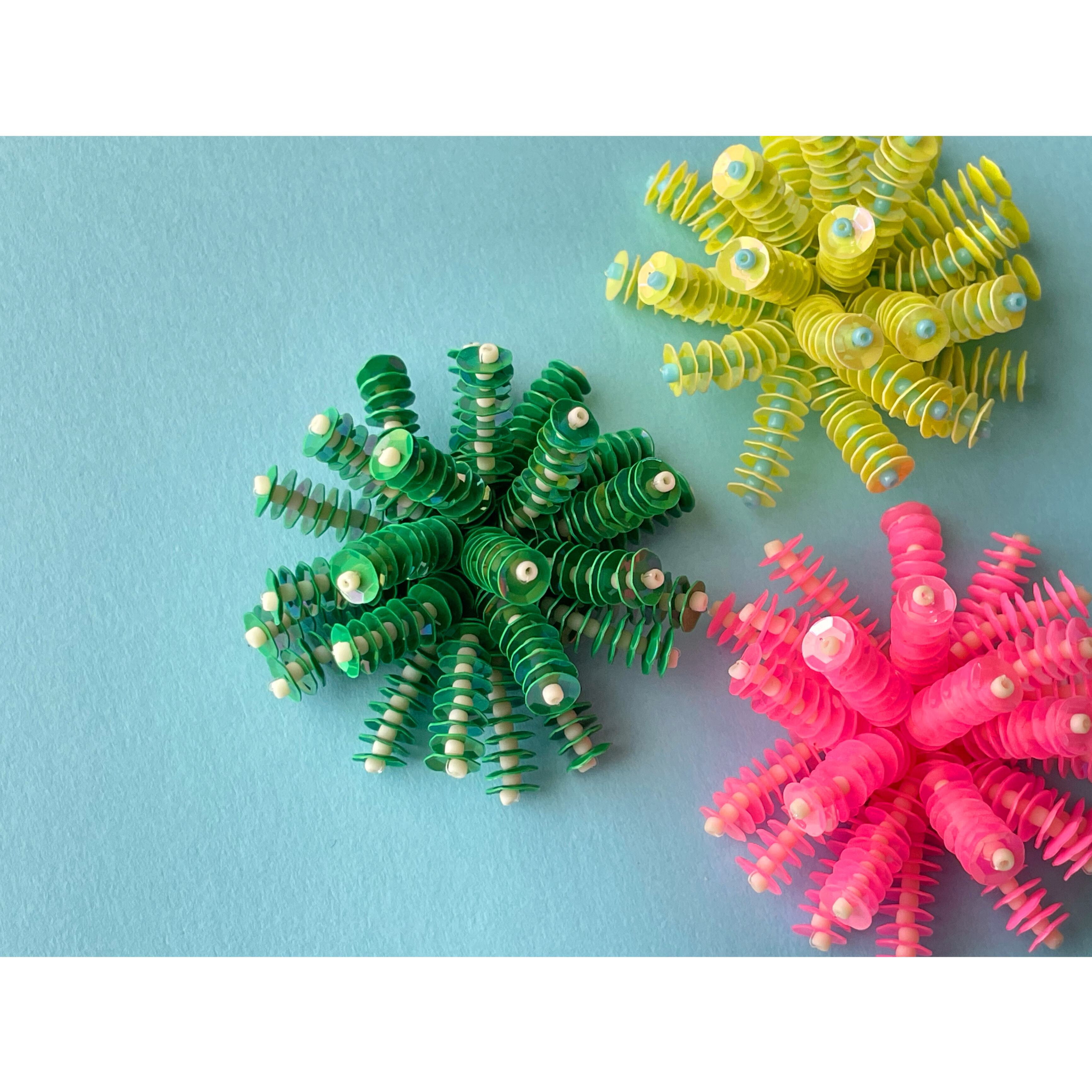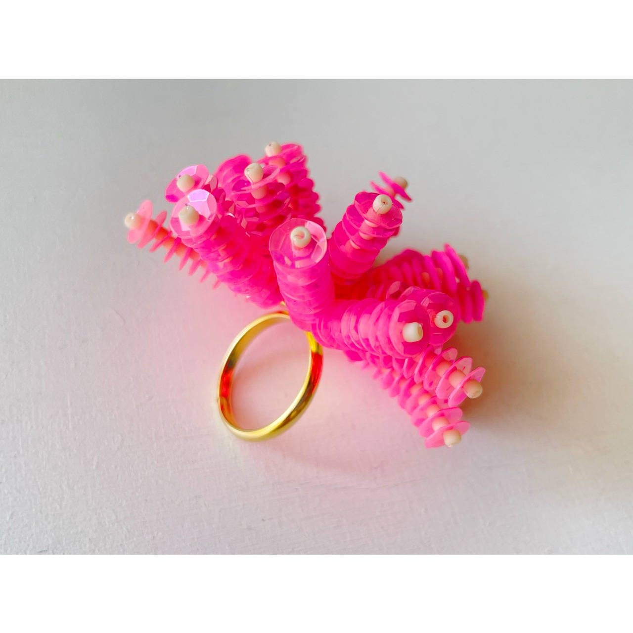 スパンコールとビーズを何度も重ねて制作したボリューミーでインパクトのあるリングです。
