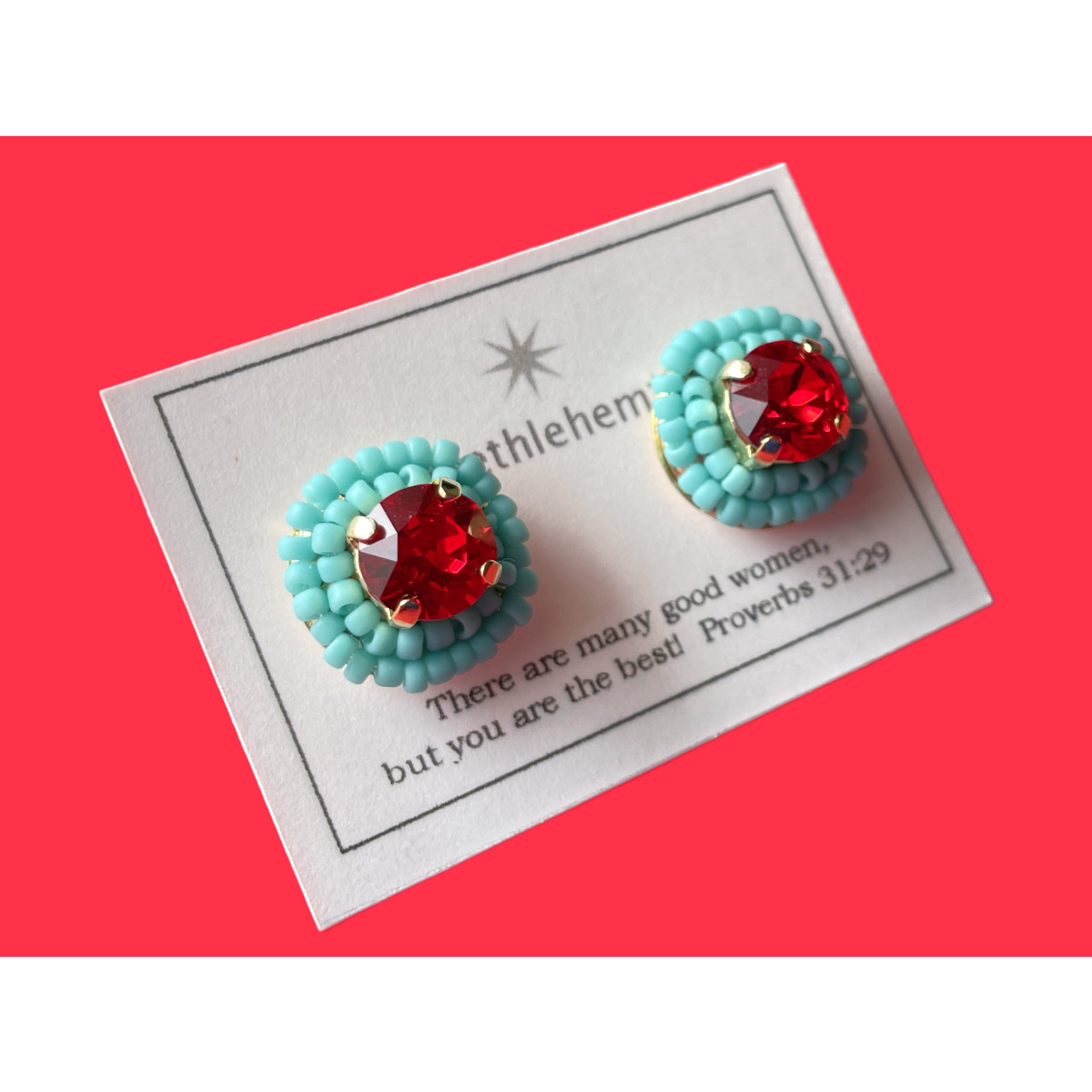真っ赤なガラスビジューとマットな水色の組み合わせはちょっぴりキッチュでキュートな雰囲気。