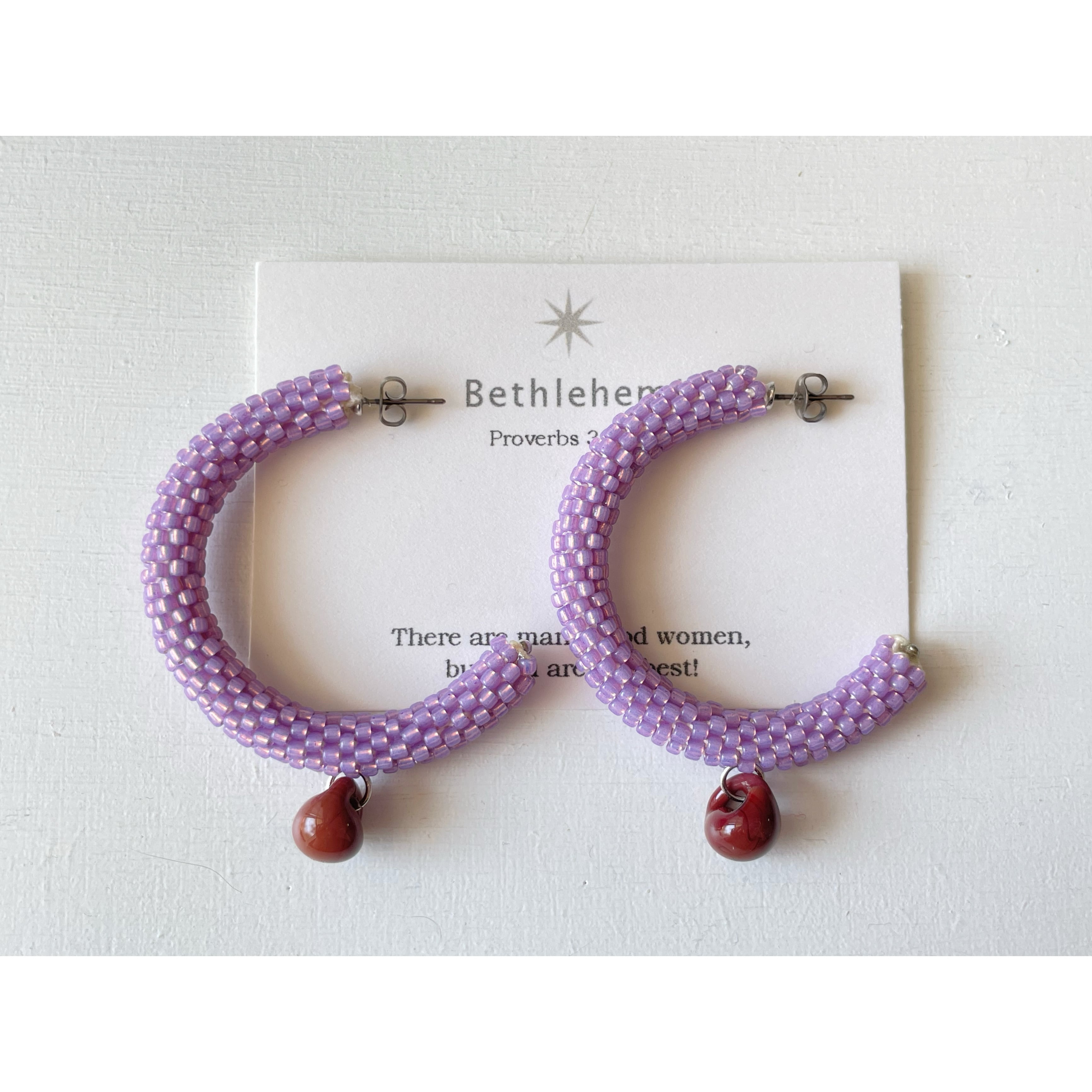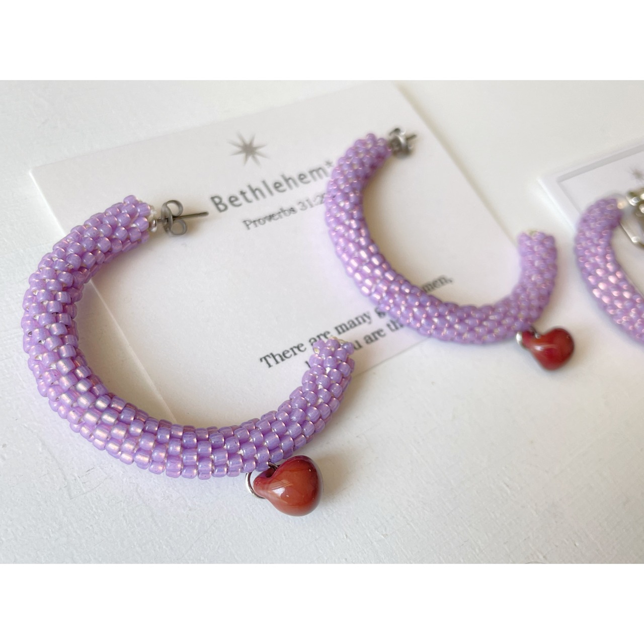 ビーズをひと粒ひと粒丁寧にチューブ状に編んだフープピアスです。